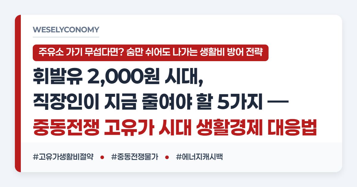 고유가가 끝나기를 기다리는 것보다, 끝나기 전까지 가계부에서 새는 돈을 막는 게 더 현실적이다. 5가지 중 한두 가지만이라도 오늘부터 점검해보자. 한 달이 모이면 1년이 되고, 1년이 모이면 종잣돈이 된다. 어려운 시기일수록 작은 절약을 응원하는 weselyconomy였습니다.